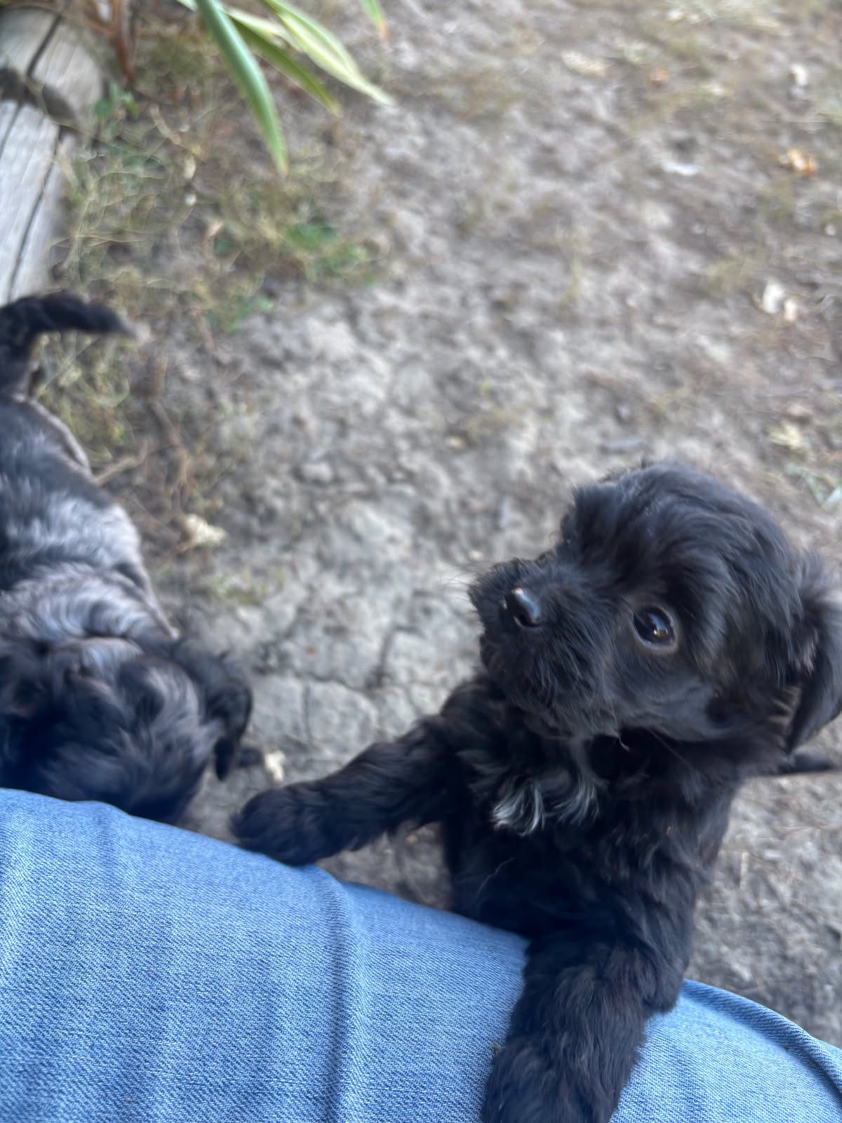 This pretty little black Aussiedoodle girl was born September 21, 2025. Her Momma is Opal a little black Poodle (weighs about 10 lbs.) & her Daddy is Timbo a tiny Toy Aussie (2 years old & weighs 5 lbs.).